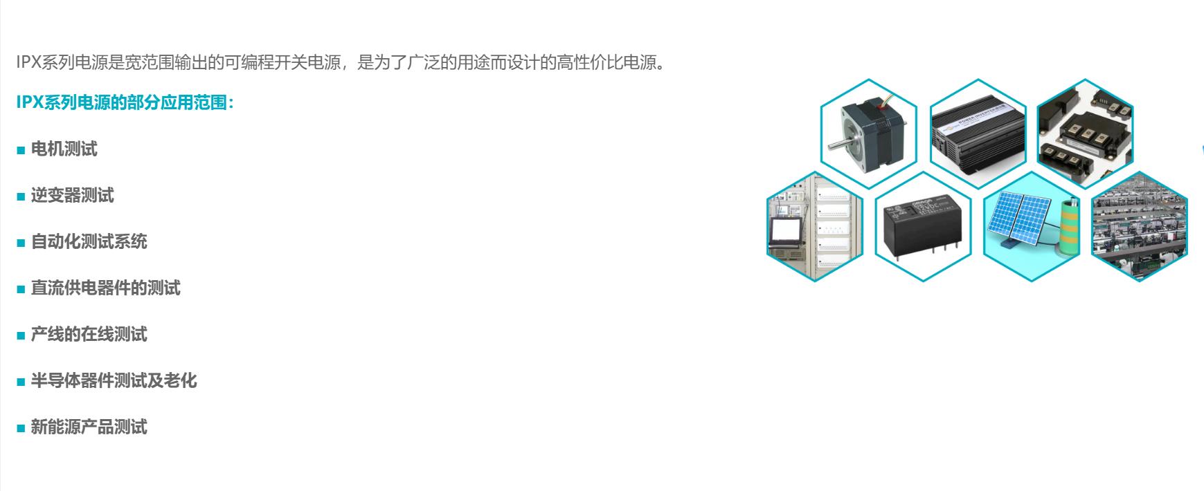 ※IPX系列电源可广泛应用于实验室测试、生产线产品检测以及老化测试等。