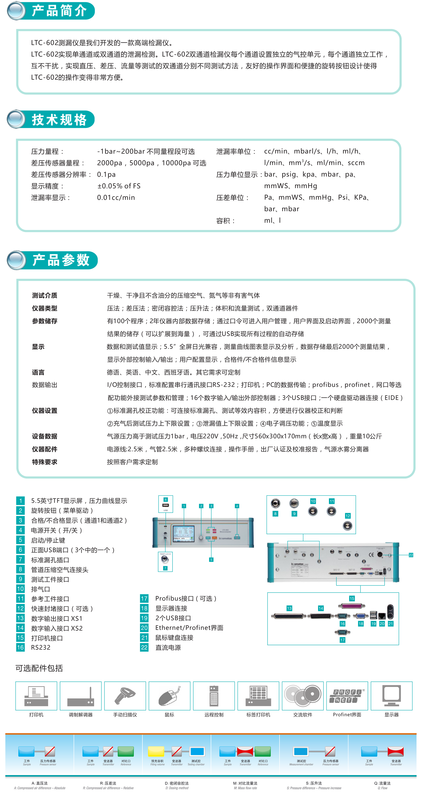 LTC-602 检漏仪泄漏测试方法(差压法,流量法,平衡法和参照法)和容积测试。